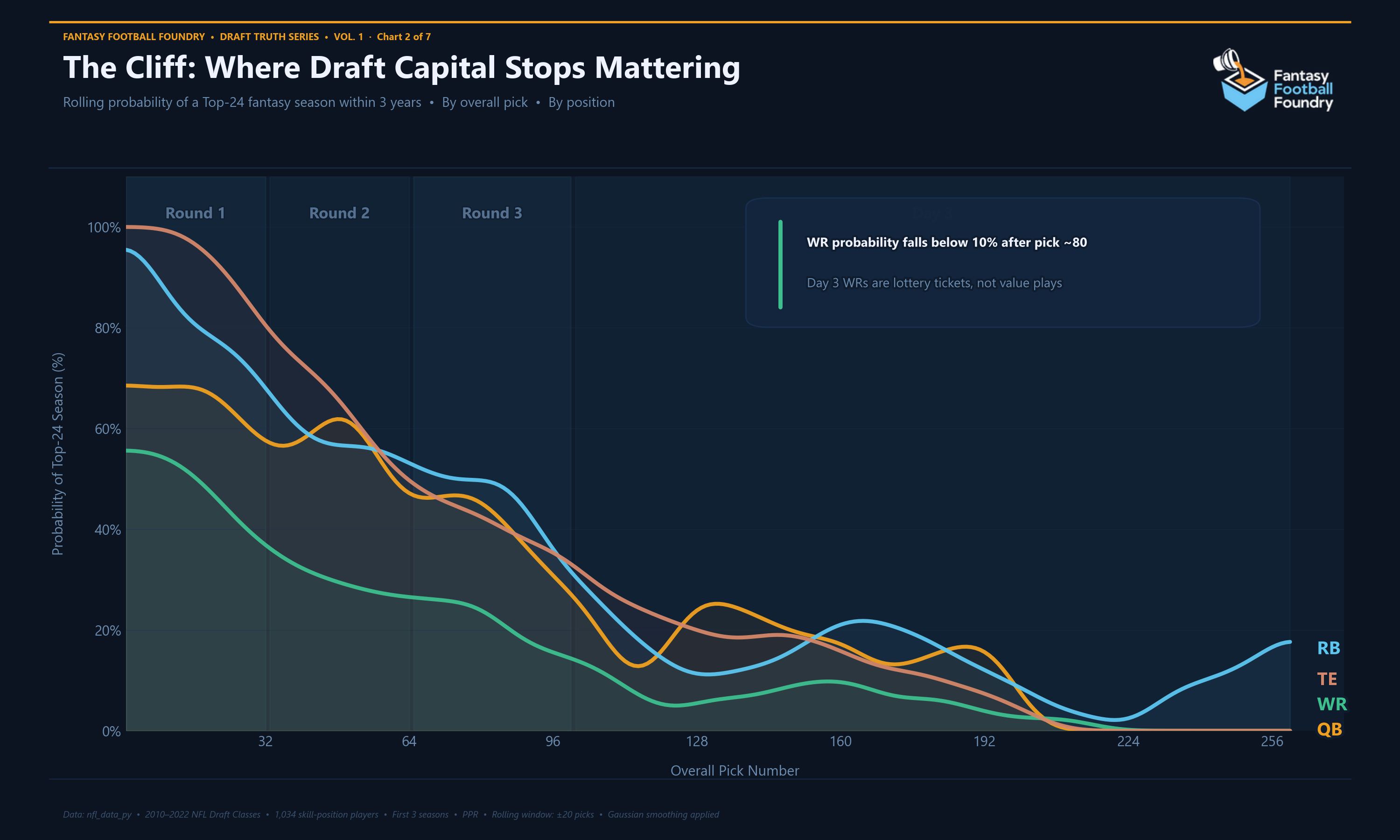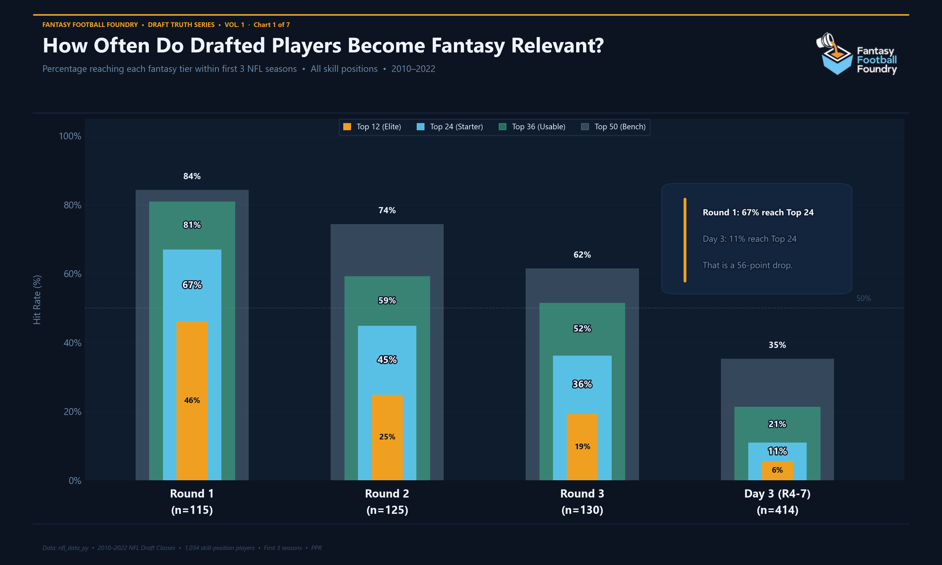 Draft capital matters more than most fantasy managers want to admit. Across 1,034 skill-position players from the 2010-2022 draft classes, Round 1 players hit Top 24 at a 67% rate while Day 3 players hit just 11%, and wide receivers are the hardest position to bet on at every draft tier.