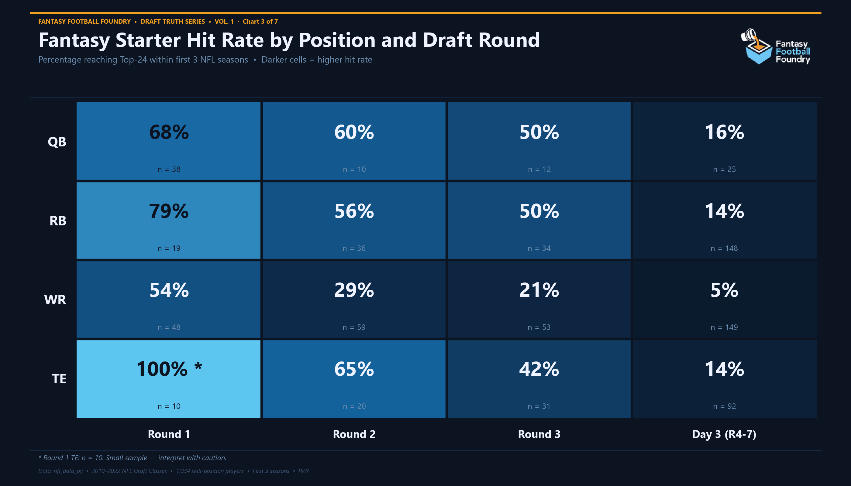- Pay up for Round 1 RBs and TEs. 79% and 100% top-24 rates, respectively. The hit rates justify the price. (TE note: n=10, small sample.)
