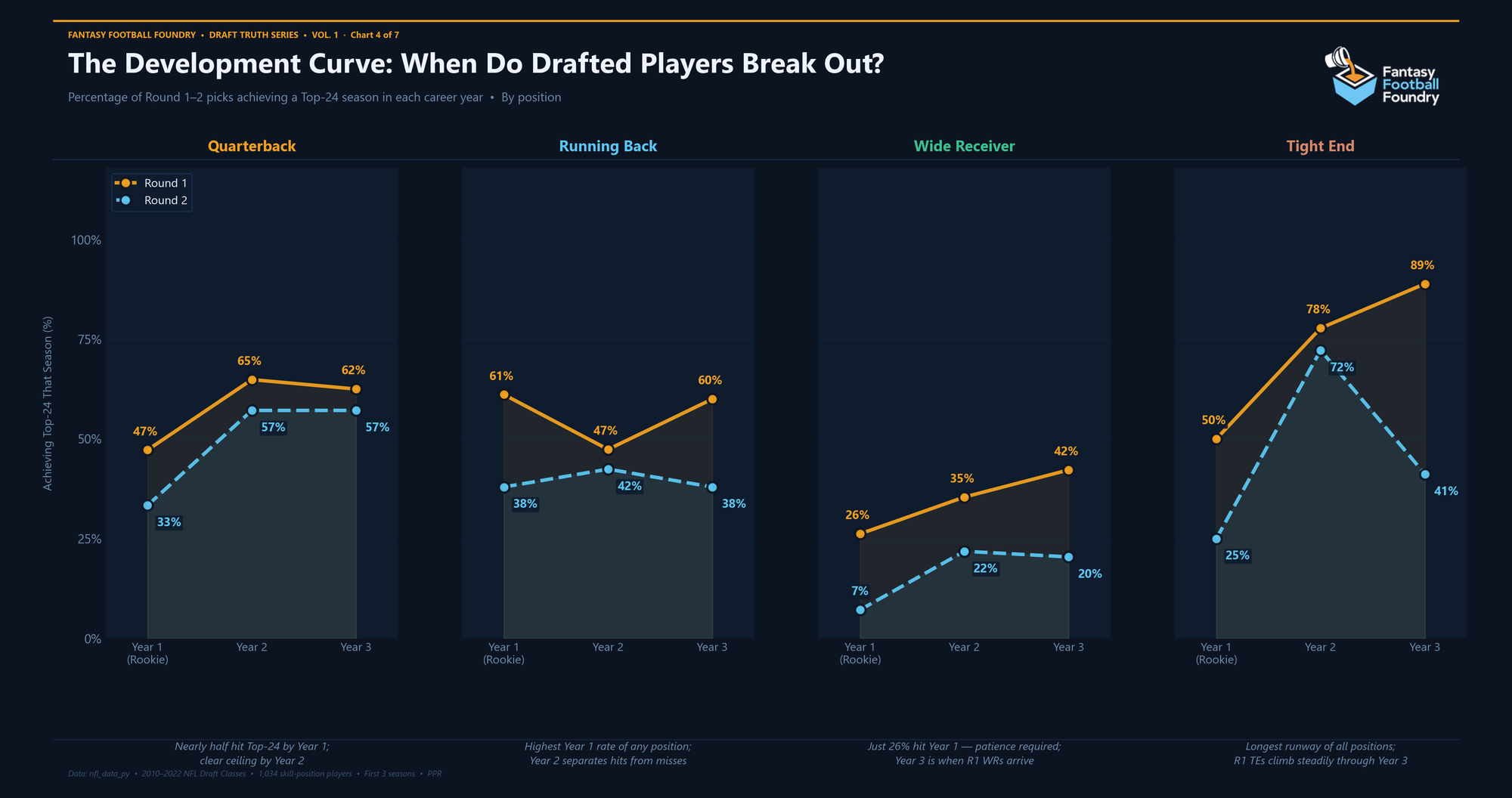 For tight ends: The Year 3 breakout is structural, not anecdotal. Round 1 TEs climb from 50% in Year 1 to 89% by Year 3. A Round 1-2 TE entering Year 3 is often underpriced because the market reads "hasn't produced yet" instead of "right on the development curve."