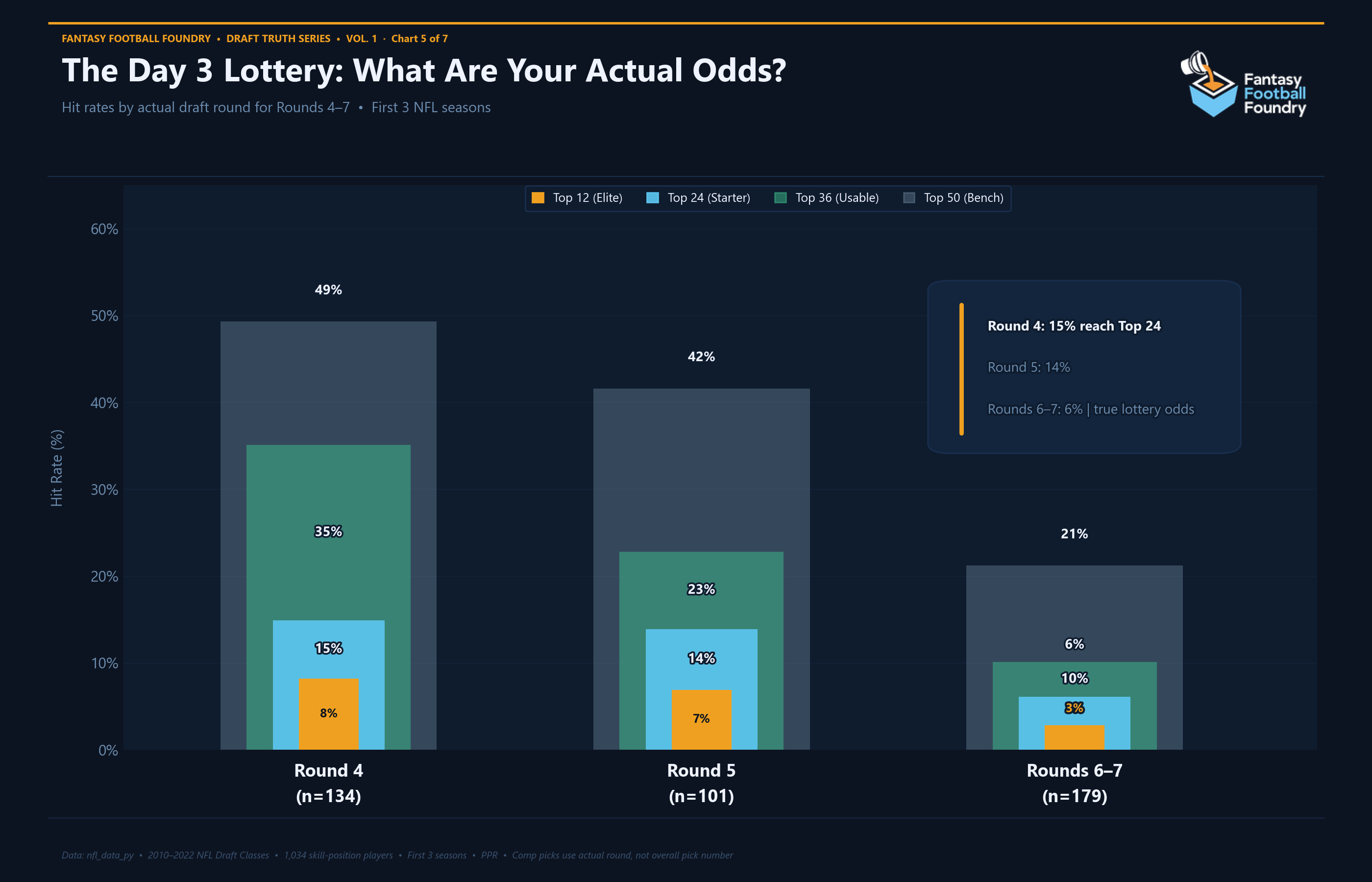 - Third: Day 3 is nearly a non-starter for elite production. 6% top-12 hit rate. For every Tyreek Hill (pick #165), there are roughly sixteen Day 3 skill players who never become fantasy starters.