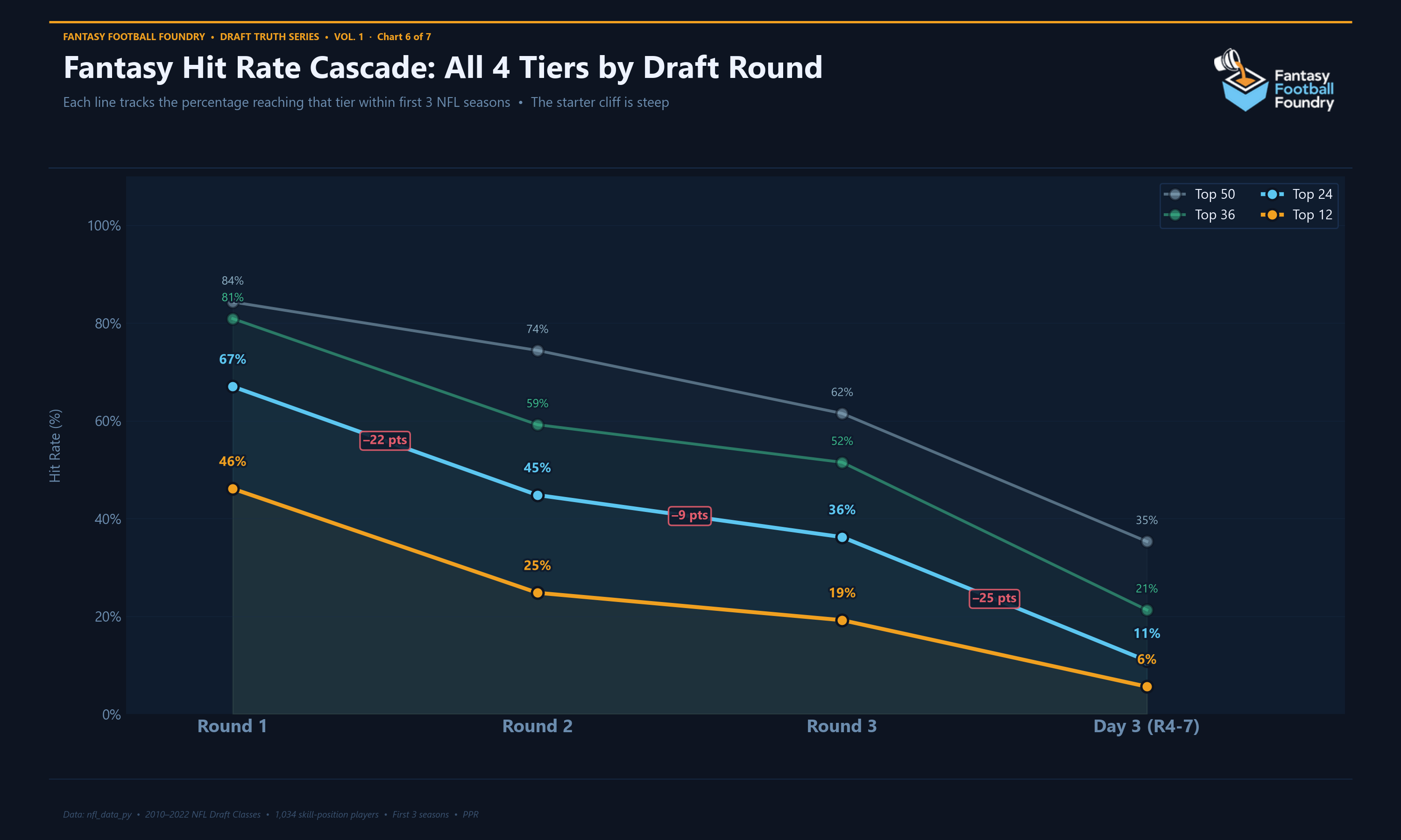 Every tier drops at roughly the same rate. The fall from Round 1 to Round 2 on the top-24 line is 22 percentage points. Round 2 to Round 3 is 9 more. Round 3 to Day 3 is the steepest: 25 points. By Day 3, even the "bench stash" tier (top 50) sits at just 35%. Two in three Day 3 skill players never become even a streaming option in fantasy.