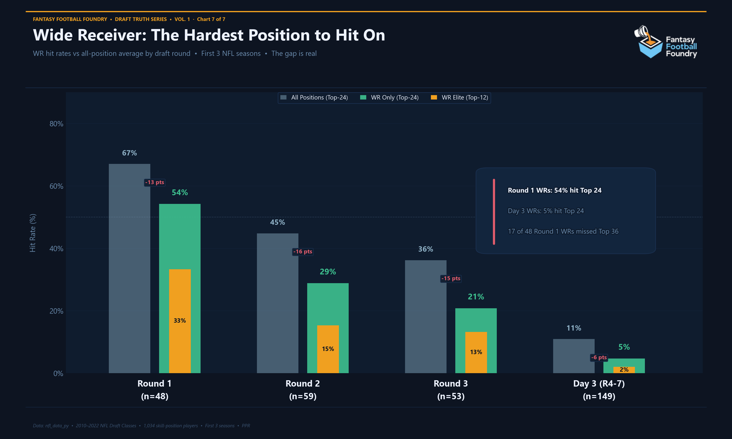 These players exist. The data doesn't deny that. What the data says is: for every Tyreek Hill, there are roughly nineteen Day 3 WRs who never became fantasy starters. You don't hear their names because they're not talked about. But they were real picks, with real hype, and they went nowhere.